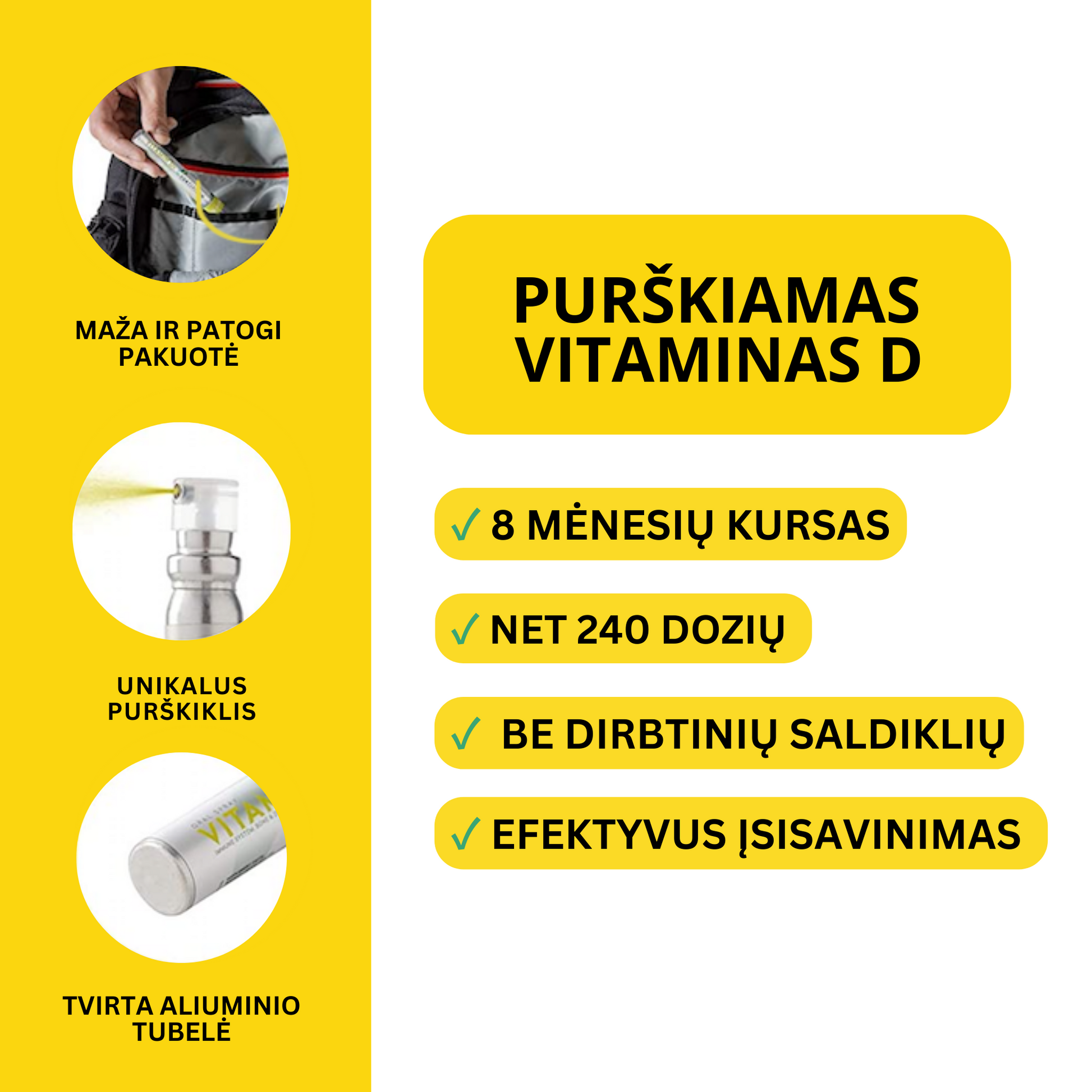 Vitaminas D3 dar vadinamas "saulės vitamino" – o Nutrioz pateikia jį moderniausia forma. Tik vienas purškimas per dieną – ir tavo imuninė sistema, kaulai, raumenys bei dantys gauna tikslią, efektyvią dozę be virškinimo apkrovos ar nurijimo sunkumų.