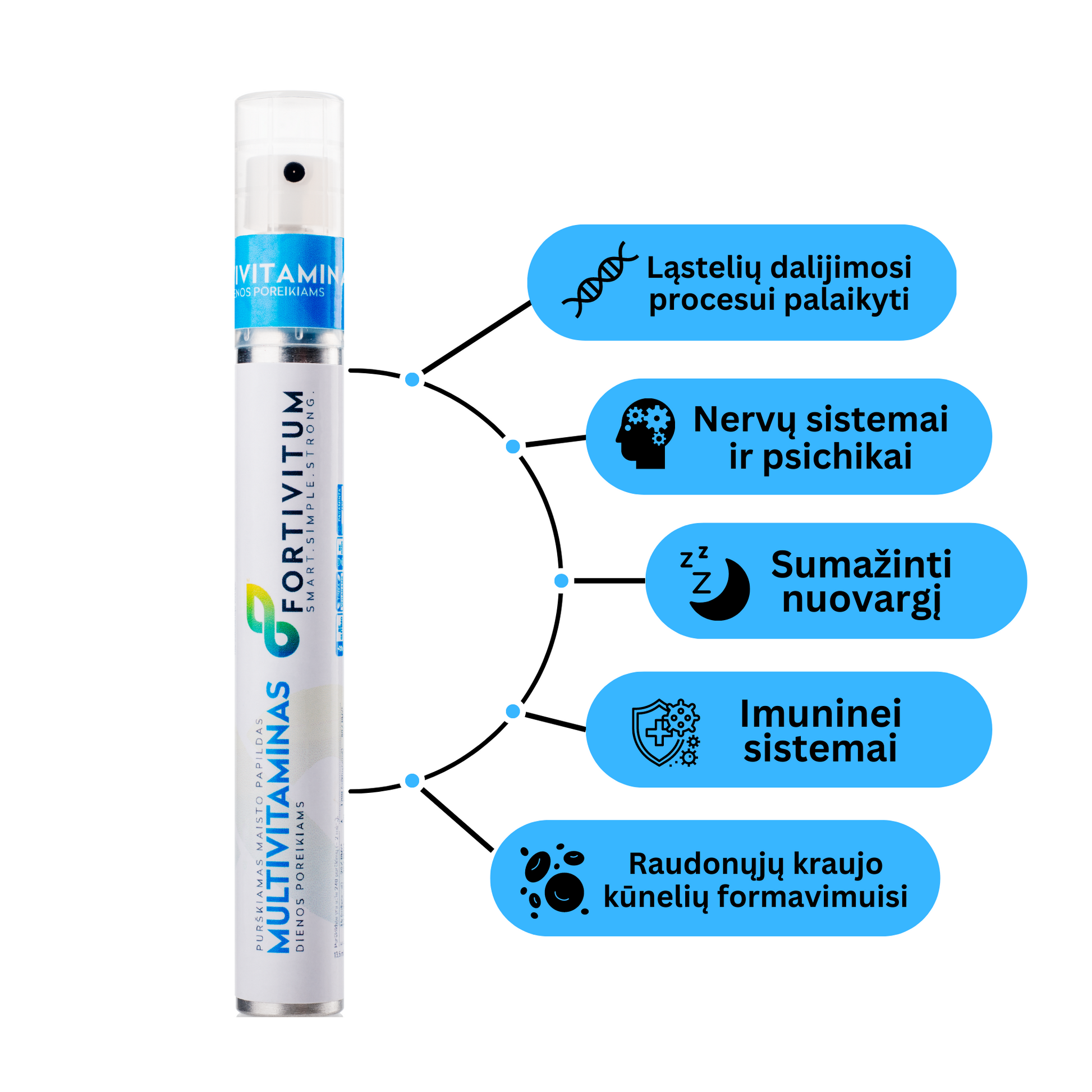 Organizmui kasdien reikia gyvybiškai svarbių vitaminų. Nutrioz Multivitaminas – tai išmanus būdas papildyti jų atsargas, ypač kai trūksta laiko, apetito ar motyvacijos nuryti tabletes. Vienas purškimas – ir esate pasiruošę dienai.